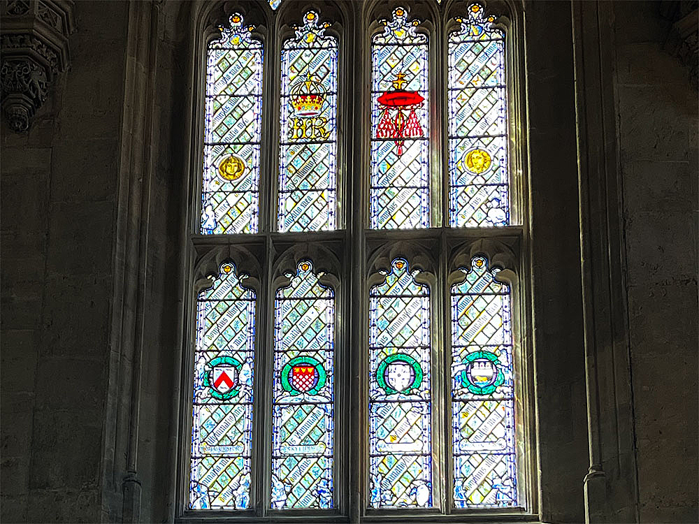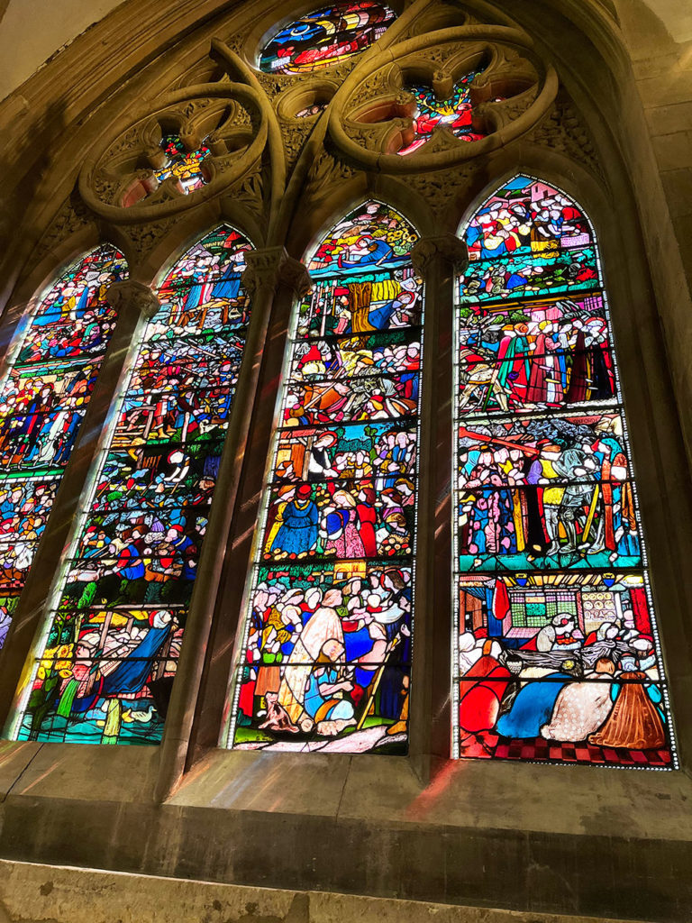 不思議の国のアリスのモデルになったアリス・リデルとルイス・キャロル、ウサギ、チェシャ猫、マッドハッターなどが描かれたステンドグラスも写真を撮ったのですが、遠すぎてあまり綺麗に撮れず…